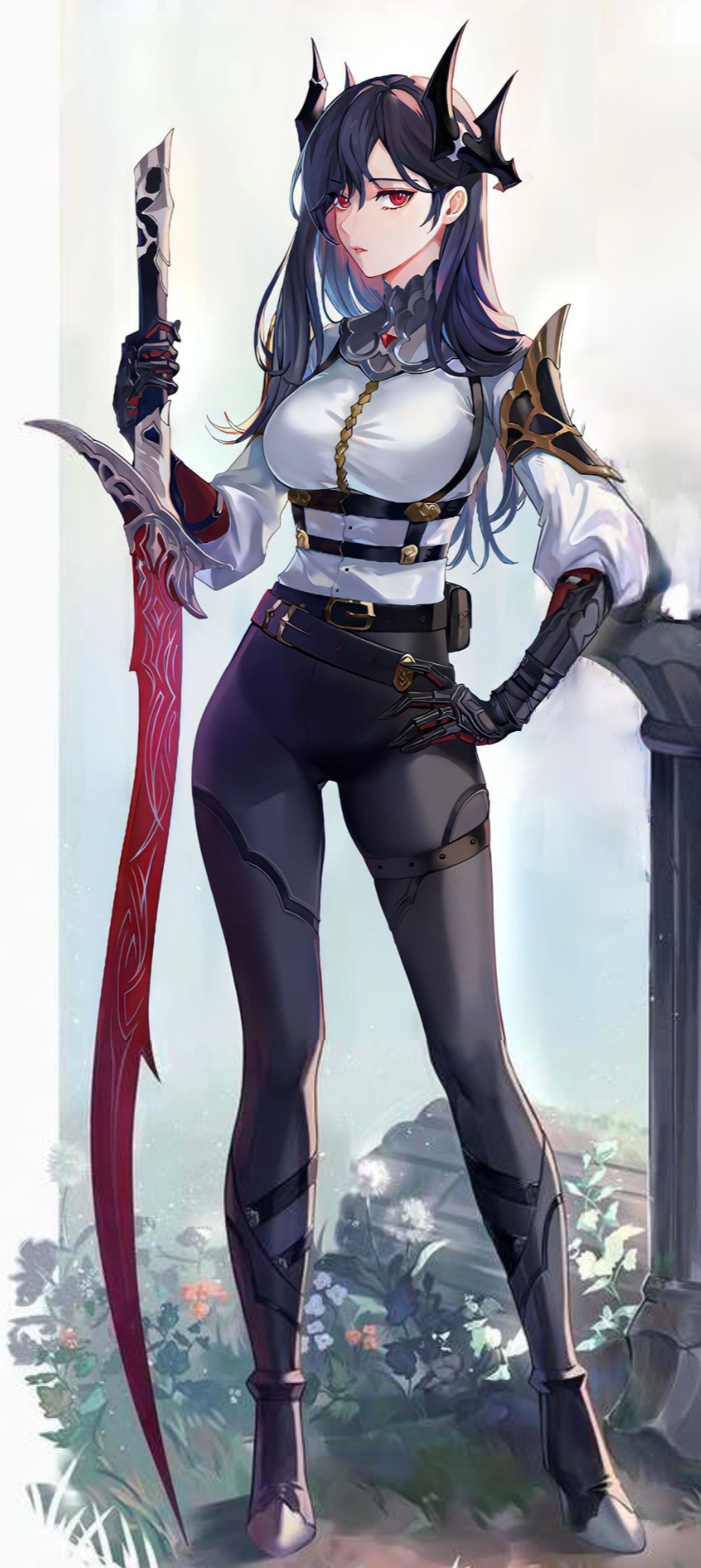 In the official art she was portrayed with the following appearance: She was rather tall compared to her mentor, Seris. She has midnight blue hair cascades down her back,framing the black horns that arch in a U-shape from her temples like dark,elegant crown.Her white button-up with gold buttons and straps in a criss cross pattern across her stomach. The shirt is tucked into her gauntlets and clings tightly to her ample chest, the gold buttons holding firm over her mounds.Her form-fitting,opaque black pants hug her toned legs,cinched at the waist by a gold-buckled belt.The overall look is sleek and commanding,combining elegance and power in perfect harmony. She holds a curved, crimson longsword with tan engravings along the blade, a black hint with a tanish guard. She sports black, clawed gauntlets that go up to her elbow, a crimson color palm of the gauntlets.