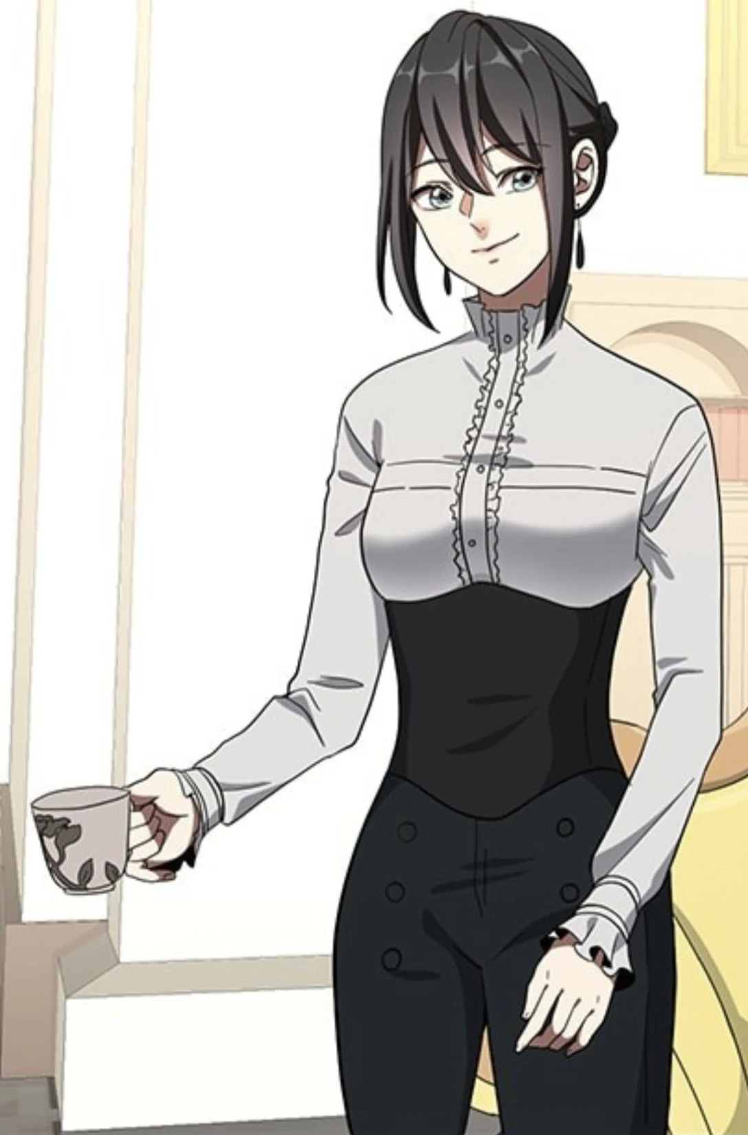 Tabitha is a beautiful young woman with black hair (she has waist-length when let down as seen in Chapter 121) that is tied into a bun where she has three black hairpins on it with long hair strands hanging in front of her face/on either side and light blue eyes.